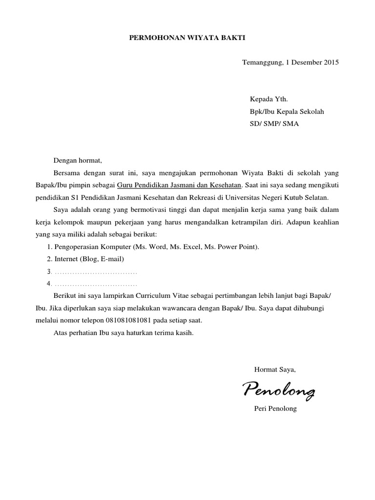 Contoh Surat Lamaran Kerja Wiyata Bakti Guru Pendidikan Jasmani